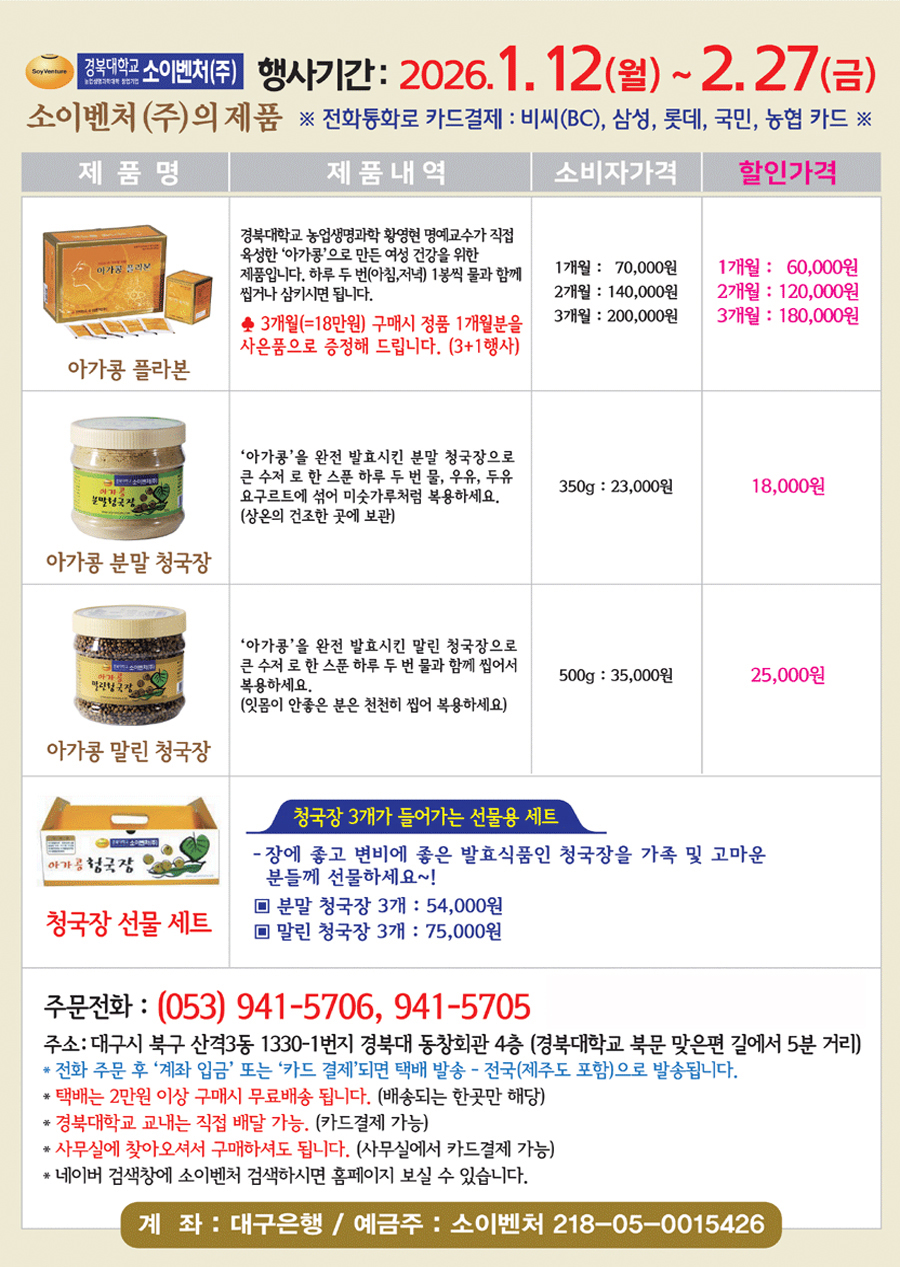 2. 아가콩 분말 청국장(350g)은 정가에서 오천원 할인된 가격으로 판매됩니다
