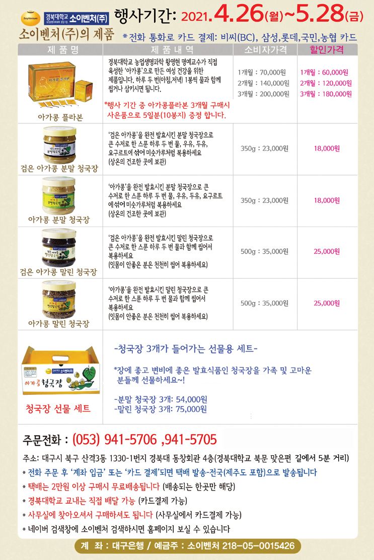 2. 아가콩 분말 청국장(350g)과 검은 아가콩 분말 청국장(350g)은 정가에서 오천원 할인된 가격으로 판매됩니다